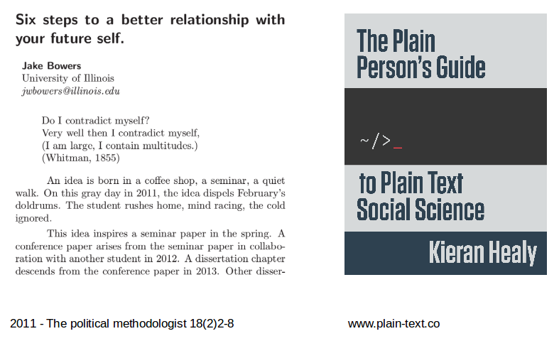 class: front <!--- Para correr en ATOM - open terminal, abrir R (simplemente, R y enter) - rmarkdown::render('static/docpres/07_interacciones/7interacciones.Rmd', 'xaringan::moon_reader') About macros.js: permite escalar las imágenes como [scale 50%](path to image), hay si que grabar ese archivo js en el directorio. ---> .pull-left[ # Encuestas Sociales ## Juan Carlos Castillo ## Sociología FACSO - UChile ## 2do Sem 2022 ## [.green[encuestas-sociales.netlify.com]](https://encuestas-sociales.netlify.com) ] .pull-right[ .right[ ## .yellow[Sesión 9: Texto simple y Rmarkdown]  ] ] --- layout: true class: animated, fadeIn --- class: middle, center  --- ## Elementos para la .red[reproducibilidad] - Carpeta de proyecto autocontenida y transferible -- - Escritura abierta: - texto simple/plano, libre de software comercial - citas - documentos dinámicos -- - Flujo de trabajo documentado y reproducible -- - Repositorio con datos y código de análisis abierto -- - Control de versiones --- class: roja, right, bottom,slideInRight # Contenidos ## 1. Fundamentos escritura simple ## 2. Markdown ## 3. Documentos dinámicos y RMarkdown --- class: roja, right, bottom # Contenidos ## 1. .yellow[Fundamentos escritura simple] ## 2. Markdown ## 3. Documentos dinámicos y RMarkdown --- ## Flujo de trabajo con procesador de texto tradicional .center[  ] --- # Abriendo el archivo de escritura tradicional  --- # Desventajas del procesador tradicional .pull-left-wide[ - Barrera de **pago/licencia** para acceder a contenidos (propiedad) - Difícil **versionamiento** y llevar registro de quién hizo qué cambio, barrera a la reproducibilidad y colaboración - No permite un documento enteramente **reproducible** que combine texto y código de análisis (en caso de utilizarlo) ] .pull-right-narrow[ <br> <br>  ] --- # Escritura libre y abierta - independiente de programa comercial - independiente de plataformas específicas - permite combinar texto y análisis en un mismo documento - foco en los contenidos en lugar del formato - permite distintas opciones de formato final --- # Inspiración .center[ ] --- class: middle  --- class: roja, right, bottom,slideInRight # Contenidos ## 1. Fundamentos escritura simple ## 2. .yellow[Markdown] ## 3. Documentos dinámicos y RMarkdown --- # Funcionamiento de escritura simple / plana - entorno: editor de texto - separación entre texto de entrada (input) y texto de salida (output) - foco en el input/contenido vs output/formato - marcas de edición: vínculo entre formato de input y output --- # Marcas de edición - Vínculo entre escritura en texto simple (input) y output  --- # Principales Alternativas escritura simple .left-column[ # **Latex** # .grey[Markdown] ] .right-column[ - sistema de escritura simple de amplio uso en la academia - alta calidad en salida a pdf - creado a comienzos de los 80 (Donald Knuth, Leslie Lamport) ] --- # Principales Alternativas escritura simple .left-column[ # **Latex** # .grey[Markdown] ] .right-column[  ] --- # Principales Alternativas escritura simple .left-column[ # .grey[Latex] # **Markdown** ] .right-column[ .medium[ - creado por John Gruber y Aaron Swartz en 2004 - forma de escritura simple con pocas marcas de formato - conversión a distintos formatos de salida (html, pdf) - Soporta encabezados, tablas, imágenes, tablas de contenidos, ecuaciones, links ... - filosofía: foco en contenido primero, el formato después. ] ] --- # Principales Alternativas escritura simple .left-column[ # .grey[Latex] # **Markdown** ] .right-column[  ] --- # Principales Alternativas escritura simple <br> | | **Control de formato** | **Marcas de edición** | **Formatos de salida** | |---------- |:--------------------:|:----------------:|:--------------------:| | LaTeX | + | + | - | | Markdown | - | - | + | --- # Markdown, pandoc y renderización  --- # Ejemplos de marcas de edición en Markdown - Texto en **negrita** entre dos astericos: `**negrita**` - Texto en *cursiva* con un asterico por lado: ` *cursiva*` - Títulos se marcan con `#` al principio, subtítulos `##` , y así sucesivamente - Imágenes: `` - Links: `[Texto clickeable](link)` --- class: roja, right, bottom,slideInRight # Contenidos ## 1. Fundamentos escritura simple ## 2. Markdown ## 3. .yellow[Documentos dinámicos y RMarkdown] --- # Problemas de reproducibilidad en documentos de investigación .pull-left[ - Proceso tradicional: cortar y pegar resultados en el documento de texto - Dificulta la **reproducibilidad**: ¿de dónde salieron esos resultados? ] .pull-right[ .center[  ] ] --- # Desafiando el modelo cortar & pegar - **Ideal de reproducibilidad**: documento donde se combine texto y código que genera resultados presentados. - **Limitación procesadores de texto**: no permiten incorporar código & resultados de manera eficiente - **Limitación software de análisis**: permiten incorporar texto solo en un formato plano, no publicable --- # Alternativa en entorno R: Knitr (Tejer) .pull-left-narrow[  ] .pull-right-wide[ - Librería R que genera documentos dinámicos, combinando (tejiendo) texto y código en una misma hoja - Diferentes opciones de formato de salida (html, pdf, word) - Basada en una versión de Markdown llamada RMarkdown ] --- # Funcionamiento 1. Artículo `RMarkdown` (.Rmd) combina texto plano Markdown y código de análisis `R` 2. `Knitr` (_cniter_ o _kaniter_) genera un archivo Markdown (.md) a partir del Rmd 3. El archivo Markdown puede ser transformado por `pandoc` a diferentes formatos de salida publicable .small[Nota: `pandoc` se instala automáticamente con RStudio, no requiere instalación aparte] --- # RMarkdown: Acepciones .pull-left-narrow[  ] .pull-right-wide[ - Lenguaje que combina código (R) y texto (Markdown) - Hoja de código escrita en RMarkdown (documento RMarkdown) - Librería de R que provee de una serie de herramientas para generar documentos dinámicos y publicarlos ] --- # Librería RMarkdown - Instalar la librería (o actualizarla, si está cargada